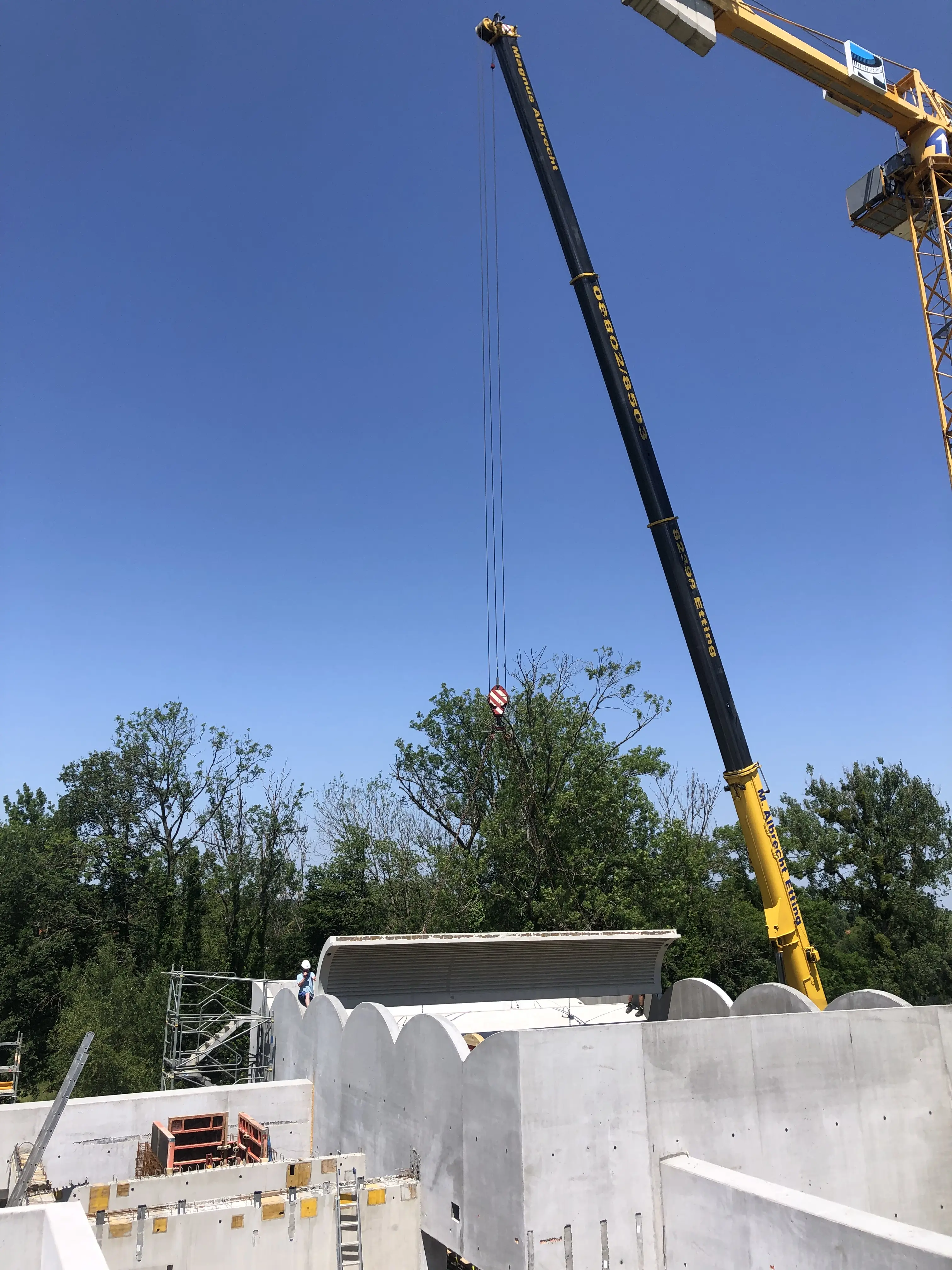 A roof for its birthday. The Carl Orff Foundation celebrates 10 July 2024 with a topping-out ceremony. In June, the time had finally come: the new building of the COMU Carl Orff Museum at Ziegelstadel 1 in Dießen got a new roof. Construction workers used two cranes to lift 11 tonnes of vaulted ceiling onto the large exhibition hall. Almost 70 years after Carl Orff himself celebrated the extension of his house at Ziegelstadel 1, another topping-out ceremony took place. Pupils from the Carl Orff School in Dießen opened the celebration with songs. Secretary General Judith Janowski then welcomed those present and expressed her particular thanks to all the sponsors who have generously supported the museum. Last but not least, site manager Torsten Huhle from the contractor Lutzenberger, foreman Christoph Meyer and concrete expert Lukas Schröther gave the topping-out speech and emptied their glasses three times to the applause of the guests: ‘May the museum be a place of knowledge, wonder and inspiration, where history comes alive and knowledge flourishes.’ Following the ceremony, celebrations took place in the courtyard of the Orff estate. Guests were able to enjoy food and drink. At an improvised table with instruments and playing cards, they had the opportunity to test a hands-on station of the future museum for the first time and sing a birthday song to Carl Orff. Fotos: Michael Tschuschner und COMU | COS Richtfest 1955 Bauarbeiter stehen auf dem Dachstuhl, am Giebel ist ein geschmücktes Bäumchen © COS Carl Orff auf dem Dachstuhl Carl Orff steht im Anzug auf dem Dachstuhl seines Hauses. © COS Das Museum bekommt ein Tonnendach Mit dem Kran wird ein Tonnenteil in ein modernes Gebäude eingesetzt. © COS Der erste Schritt fürs Dach ist gemacht! Alle Betonteile sind verbaut Ein modernes Betongebäude mit mehreren halbmondförmigen Kuppeln am Giebel. © COS Die Richtkrone An einem Baukran hängt eine große grünumwundene Krone. © COS Kinder singen ein Ständchen zum Richtfest Kinder singen und spielen auf Xylosphonen. © Foto: Michael Tschuschner Die Bauleute sprechen den Richtspruch Über den Rand eines Betongebäudes im Rohbau ragen drei Köpfe mit Helmen. © Foto: Michael Tschuschner Buffet fürs Richtfest Auf einem Buffet stehen Platten mit Essen und Blumendeko und Tellerstapel. © COS Ein Geburtstagsständchen für Carl Orff Frauen stehen an einem Tisch mit vielen Instrumenten und machen Musik. © COS Artikel in News • 19. Jul 2024 Teilen Twitter Facebook LinkedIn